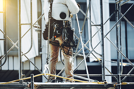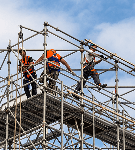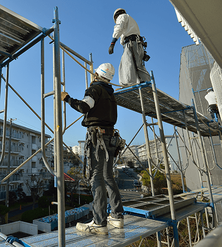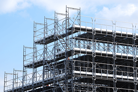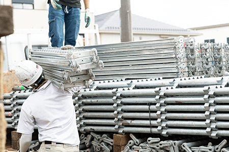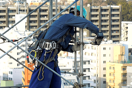 足場工事とは、建築現場など高所で作業をする際に、足元を支える足場の工事のこと。
